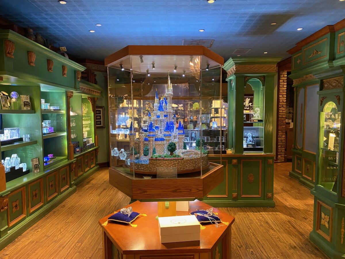 Walk into Crystal Arts on Main Street, U.S.A. at Magic Kingdom and something shifts. It doesn’t feel like a gift shop. It feels like a gallery. Glass animals catch the light. Swarovski-covered castles sit behind velvet rope. Somewhere near the back, a craftsman is bent over a piece of glass, engraving your name while you watch.