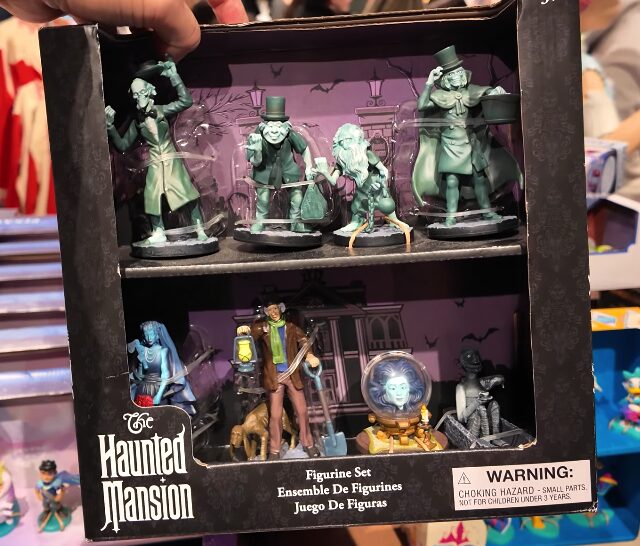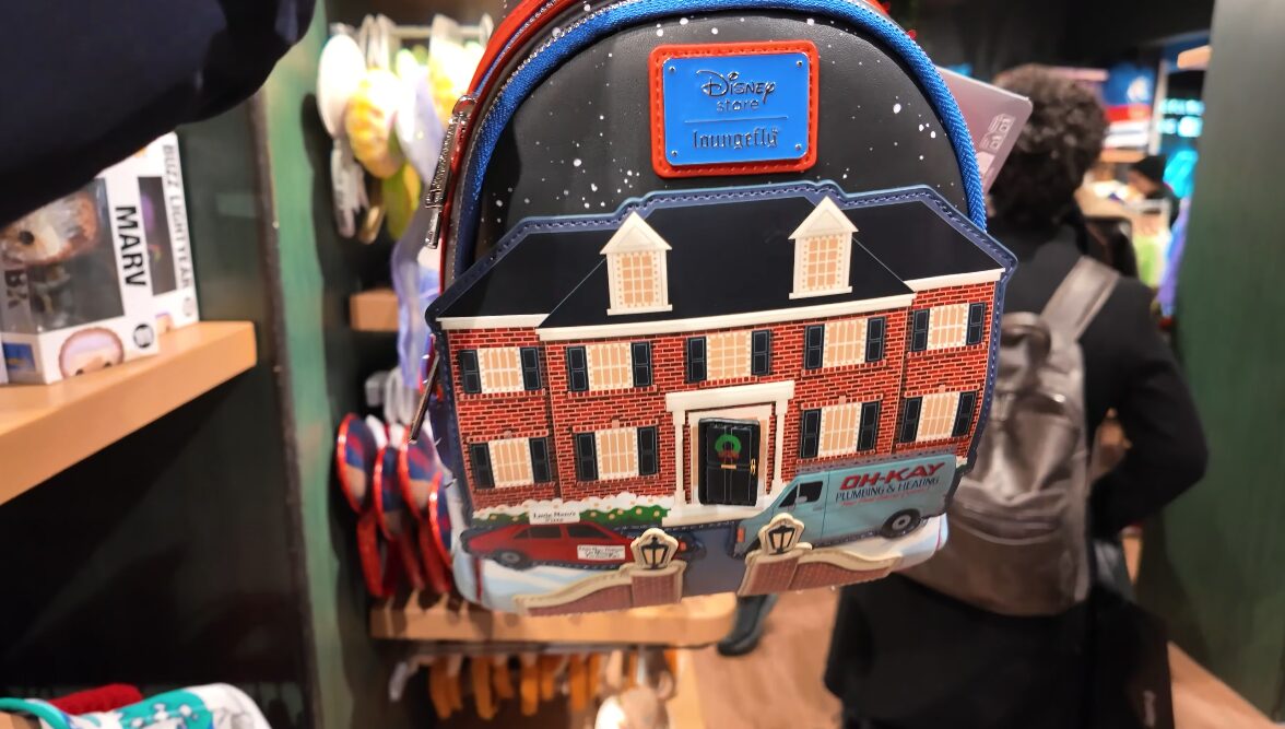 Other people’s visits look different. The Haunted Mansion figurine set — the full cast, Hitchhiking Ghosts, Madame Leota in her crystal ball, the Hat Box Ghost, all eight characters packaged in a display case designed to look like the ride itself — that wasn’t prominent when we were there. Neither was the Home Alone Loungefly, the one shaped like the McCallister house with the Oh-Kay Plumbing van parked outside and a Christmas wreath on the door. Both of those exist because Disney now owns Fox, which means properties like Home Alone are technically Disney merchandise now. Both of them have appeared in other people’s walkthroughs of the same store.