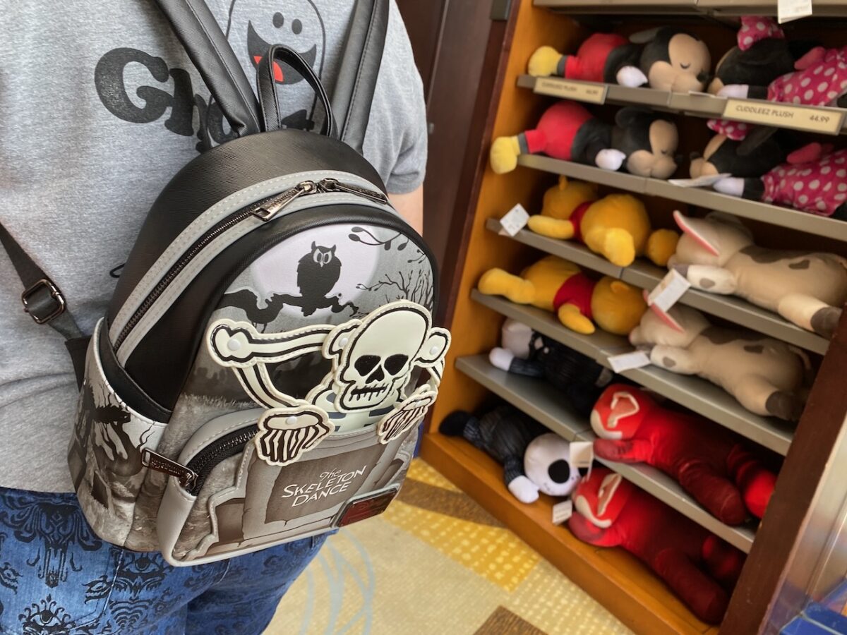 I use an Arc’teryx Mantis 26 — a 26-litre backpack in blue that’s been on more Disney trips than we can count. Jill carries her Loungefly Skeleton Dance 95th Anniversary Mini Backpack, which she bought at the Orlando Premium Outlets in 2024 and has been her go-to ever since.