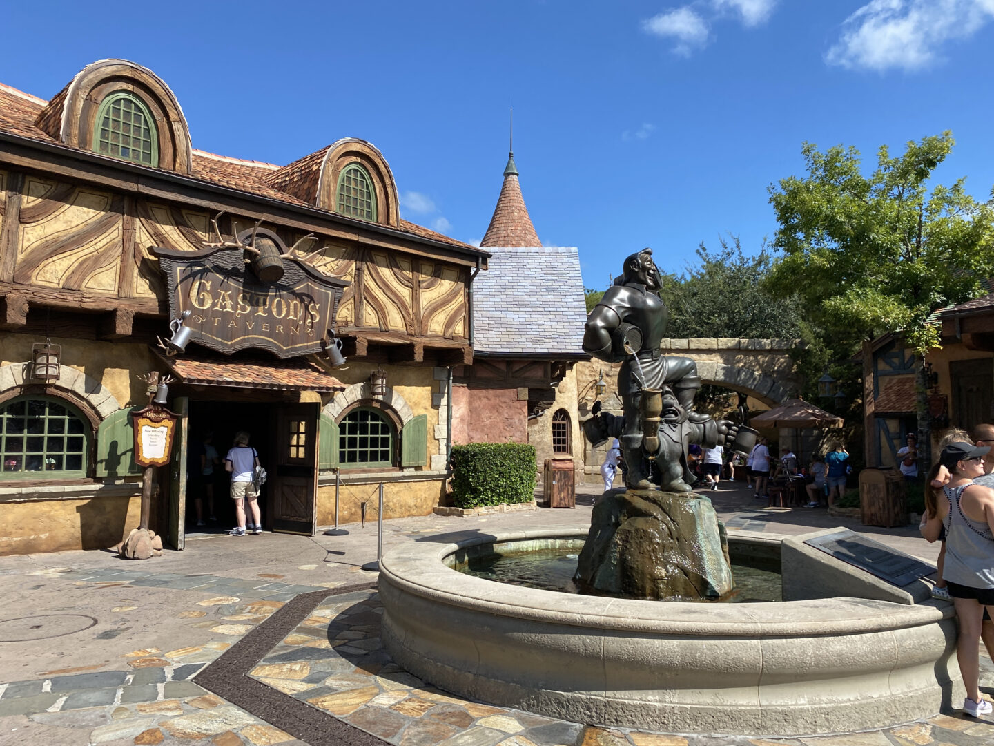 That inscription is one of the best pieces of in-world storytelling in all of New Fantasyland. In five words — “from me, Gaston” — the Imagineers captured everything about this character. The fountain wasn’t in the 1991 film. Disney invented it specifically for the park, and then invented a backstory in which Gaston commissioned a monument to himself and called it a gift to the village.